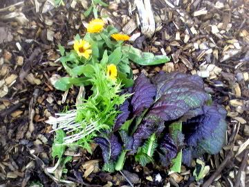 Today's harvest: some lettuce and whatever that spiky, spicy, lettuce-y stuff is. Also some Calendula flowers, which I have floating in water on the table. A present for Myra.