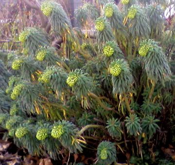 One spends a certain amount of time picking up litter in the urban garden. It's just a fact of life. That's what I did most of my garden time today, in fact. But it brought me into parts of the communal space I don't always visit, which was nice. Fruit trees line the east and north borders. In between them, many things thrive. Here is a Euphorbia (my favorite here in the Pacific North West) with its early, yellow green blossoms. It's probably 4 feet tall and 5 across. It's everywhere. I'm sure people find it common as the day is long, but I am in love.